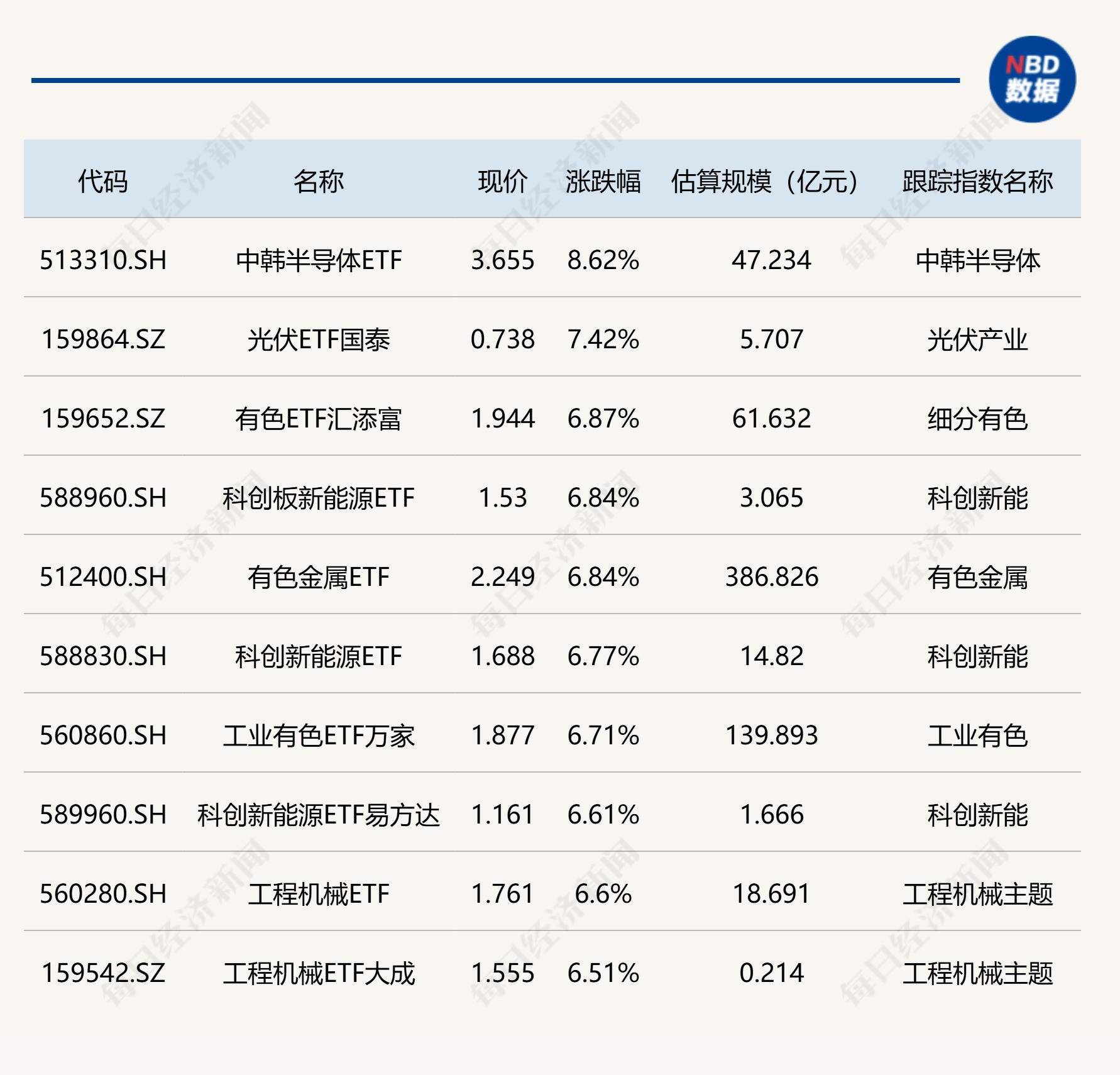 ETF涨跌幅方面,中韩半导体ETF涨超8%,光伏、有色相关ETF涨超6%。